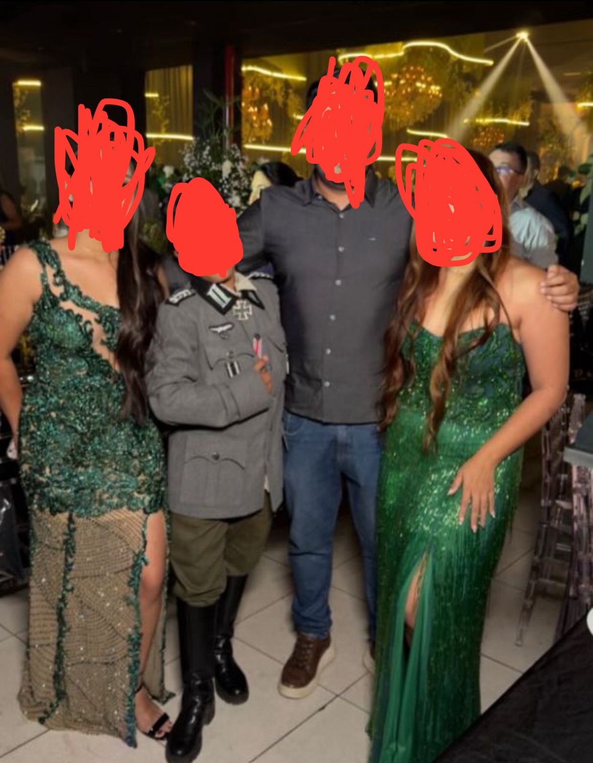 Mas que justificativa “excremental”, minha patroa. Como danado o boy entra vestido de “Mini-Hitler”, ninguém da portaria do evento viu, nenhuma das formandas que tiraram fotos com ele viram nada, ninguém que tava na festa viu? Ou todo mundo viu e ninguém se incomodou com o “Mini-Nazista?”. Isso é crível?