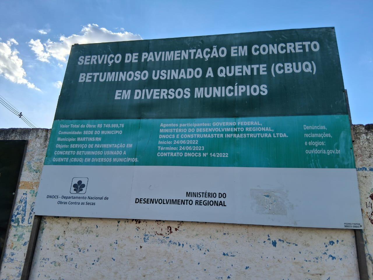 Ele conta que a então prefeita Mazé (UB) usou a obra para promover o então candidato ao Senado Rogério Marinho (PL), ex-ministro do desenvolvimento regional, cujo DNOCS é subordinado. “Na época o ministro era Rogério Marinho e aí a prefeita, no caso ex-prefeita derrotada do município de Mazé, ela era um dos seus principais cabos eleitorais na cidade. A prefeita conseguiu junto com ele que encaixasse Martins dentro desse pacote de asfalto levando Martins, porém, até hoje nunca se consolidou, a placa da obra está lá”, relatou.